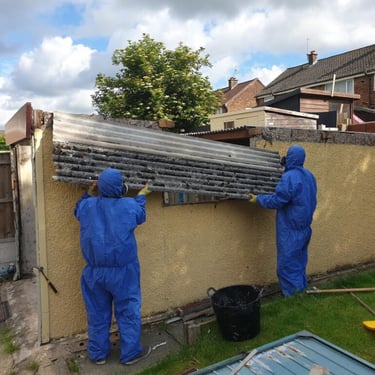 Asbestos roof removal is generally straightforward. Firstly our operatives are trained to the highest standard having an the necessary Cat B training and an annual medical and yearly face fit testing. They will then put on a paper suit, wellies, gloves and a half face Sundstrom mask for which they are face fit tested. They will then spray the sheets before hand with surfactant which will help reduce any fibre release. Then they cut the screws/bolts carefully with either bolt crops or a reciprocating saw/angle grinder. The sheets are then carefully removed and wrapped in 1000ga polythene or double bagged in 500ga coded asbestos bags. Once the sheets are removed we check for any debris which if found will be vacuumed up using a specialist HVAC. All materials are then disposed of via a licenced waste transfer station with the transfer station us and the client receiving a copy of the hazardous waste consignment note.